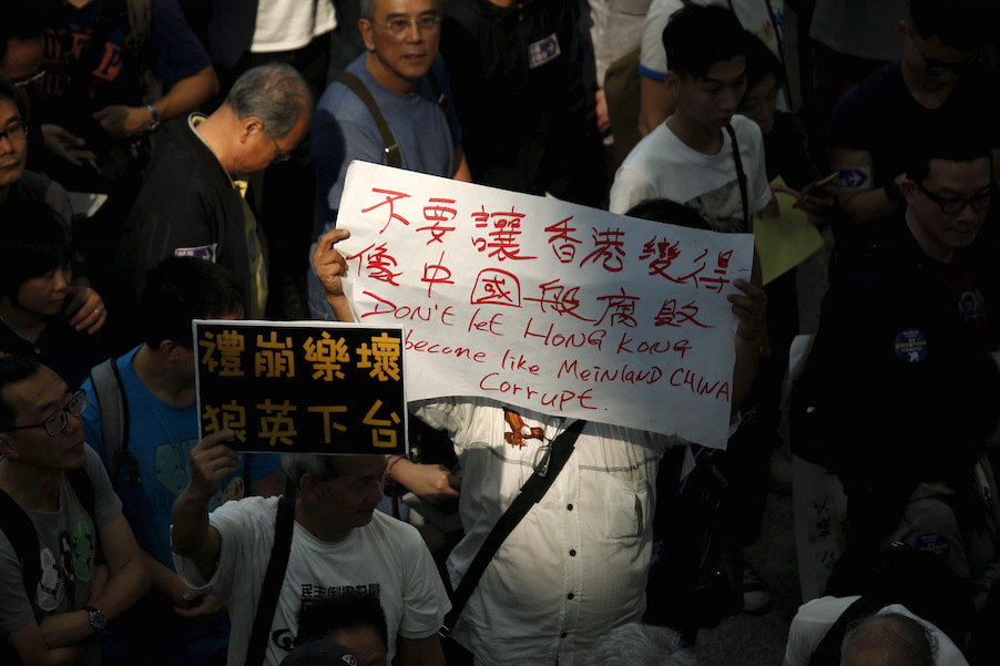The demonstrators said they were angered by a March incident involving one of Leung’s daughters at the airport after she accidentally left a carry-on bag outside. Some accused Leung of exercising his privileges as Hong Kong’s leader to get airport staff to deliver the bag to his daughter in the airport’s restricted area even though regulations say that bags must go through security with their owners.
