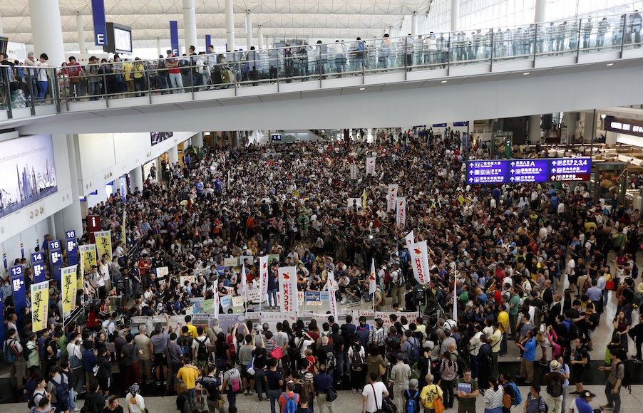 Chanting “Safeguard the sky of Hong Kong” and holding signs demanding Leung step down, the protesters staged a three-hour sit-in as international travelers streamed by at one of Asia’s busiest aviation hubs.