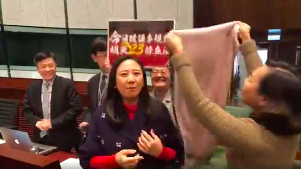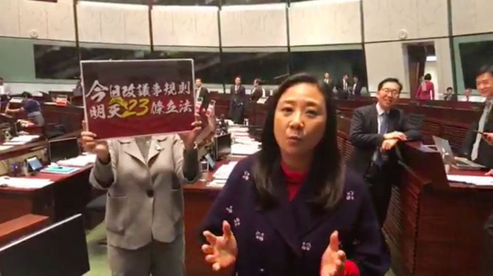 “I don’t think Hongkongers are stupid enough to believe that a change to the rules of procedure will lead to a Article 23 legislation,” she can be heard saying in reference to the sign. “Not everyone is stupid like you lot.”