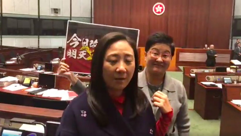 “I don’t think Hongkongers are stupid enough to believe that a change to the rules of procedure will lead to a Article 23 legislation,” she can be heard saying in reference to the sign. “Not everyone is stupid like you lot.”