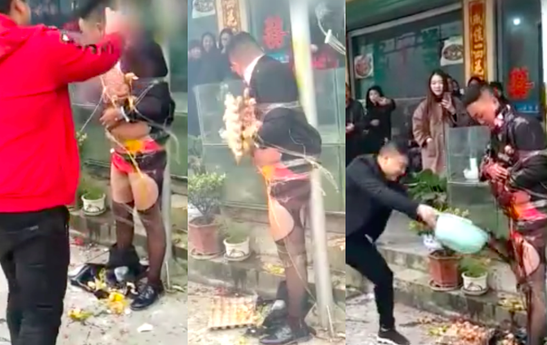 Video posted on mainland media shows one groom was recently forced to put on red panties and stockings, then tied to a lamp post. That’s when the real fun began, as friends and relatives can be seen pelting him with eggs and spraying him with paint. At one point a tub of what we’re guessing was black paint is poured onto him.