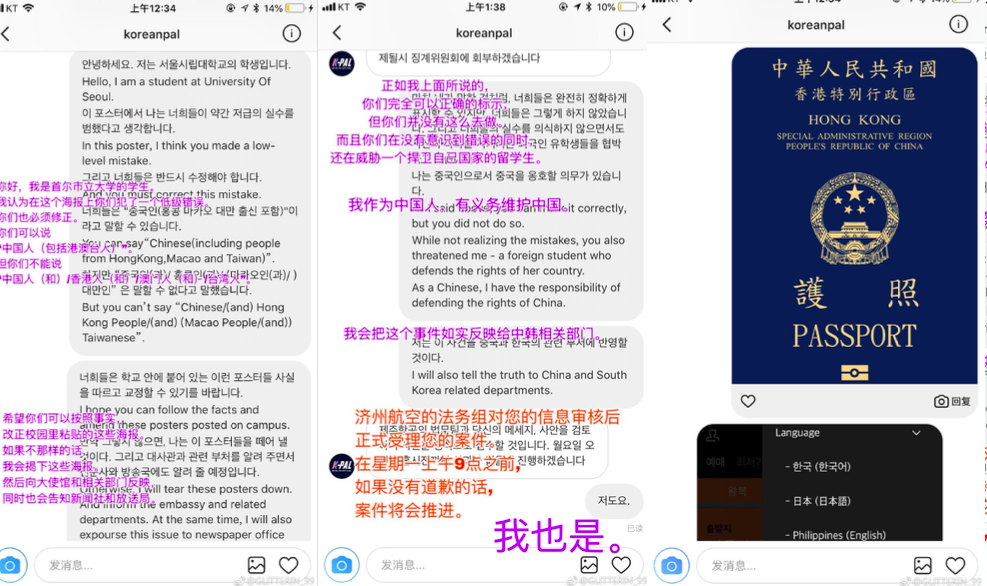 “In the process of making posters, you made mistakes because of your ignorance, and I did not feel your respect for China,” the user wrote, claiming victimhood as a foreign student.