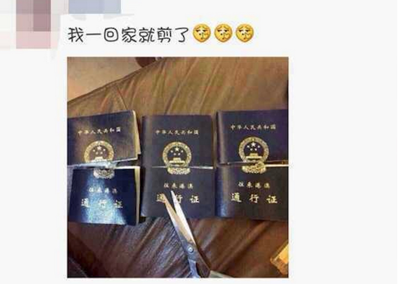 Facebook user Julian Yip posted screenshots from a Chinese social network that appear to feature photos of six vandalized permits, with the users declaring they’re “not going [to Hong Kong and Macau] anymore”.