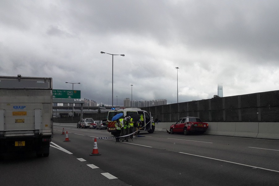 At around 4:25am yesterday, a taxi reportedly lost control on Tsing Kwai Highway, near Mei Foo Sun Chuen. It crashed into a road maintenance truck before hitting three workers who were rearranging traffic cones on the highway.
