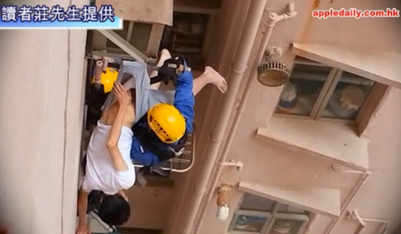 Firefighters first tried to rescue him from a ladder, but failed. They then broke into the 6th floor apartment to reach the man, while lowering a rope from the unit above.