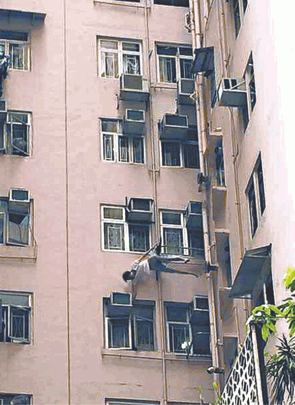 The man, surnamed Yuan, is believed to have jumped from his 11th floor apartment at around 10:30am, only to be saved five stories down when his trousers got caught on an air conditioning unit, reports Apple Daily.