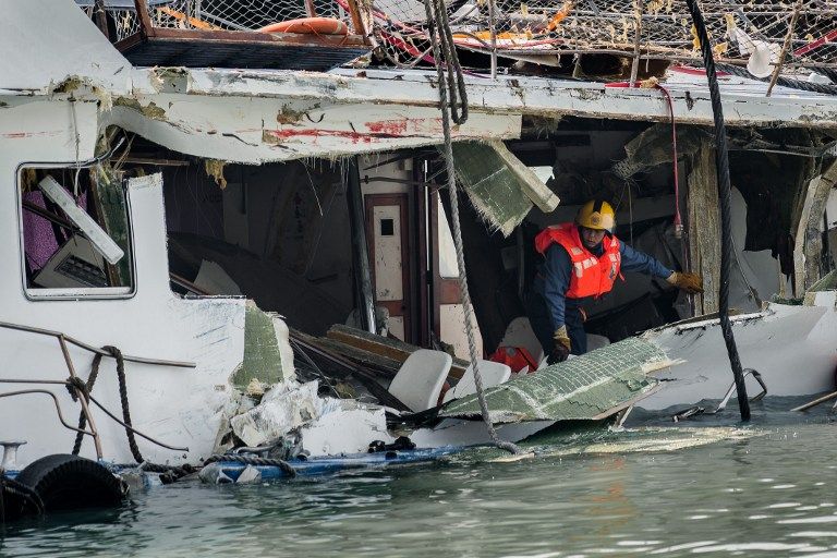 A fireman inspects the back end of the badly damaged Lamma IV passenger boat on Oct. 3 2012 (AFP)