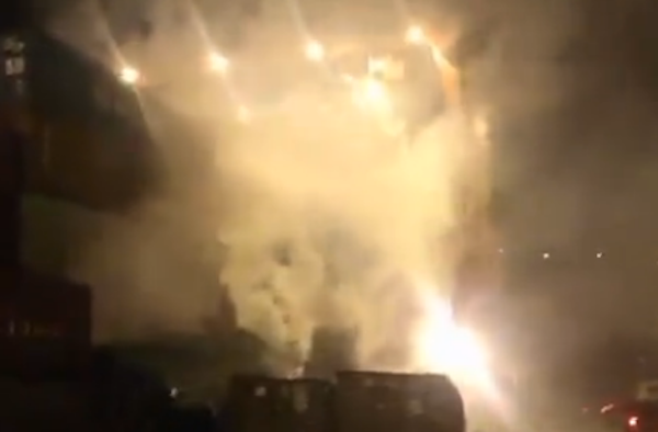 The massive explosion completely deformed the container and blew off two more containers sitting on top of it. The smoke from the explosion overwhelmed the area and fire fighters were called to extinguish the fire.