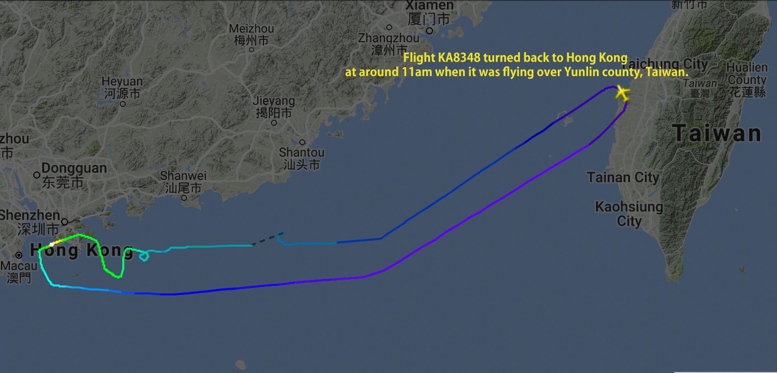 According to the Aviation Herald, the aircraft burned off fuel and landed safely back in Hong Kong at around 12:45pm, about two hours and 45 minutes after departure. Upon arriving in Hong Kong, the plane spent 90 minutes on the ground being refueled before taking off again (maps in tow) with a new crew.