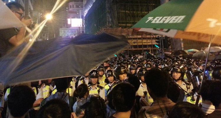 Police charged protesters using raised umbrellas for protection against pepper spray and batons on a busy main road in the bustling Mongkok district, but were forced into a partial retreat as the sun began to rise, to cheers from the crowd.