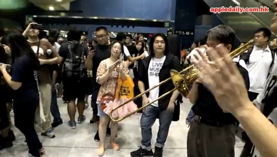 Musicians wielded both traditional Chinese and Western instruments – including a set of bagpipes – and played in the concourse amid heavy staff and police presence. Some shouted the slogan “Instruments are not guilty, arts have their truth” amid the protest, according to Apple Daily.
