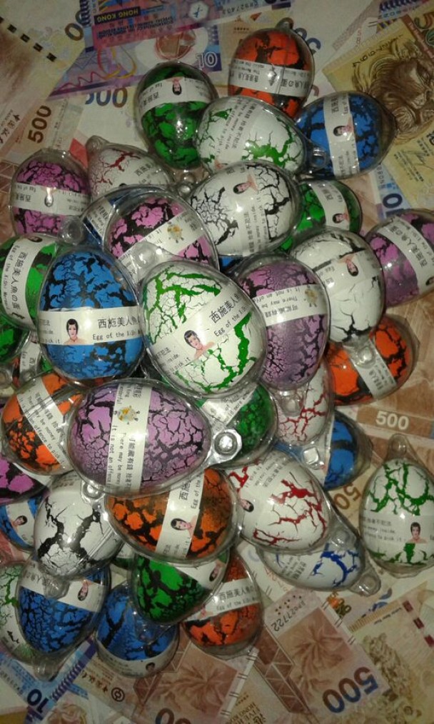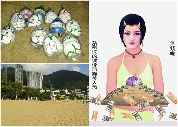 On the eggs it is printed: “The mermaid of Hong Kong makes the world more wonderful. There may be money inside. It is not an offence to pick it up.”