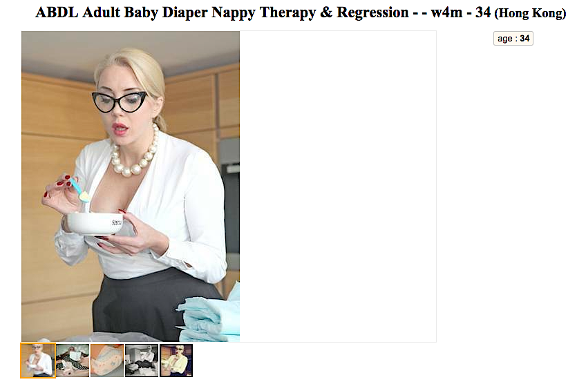 The busty blonde (please someone tell us she’s your boss) claims to specialise in regression, and to understand the psychology of adult babies and their needs. We’d check her paperwork though if we were you.