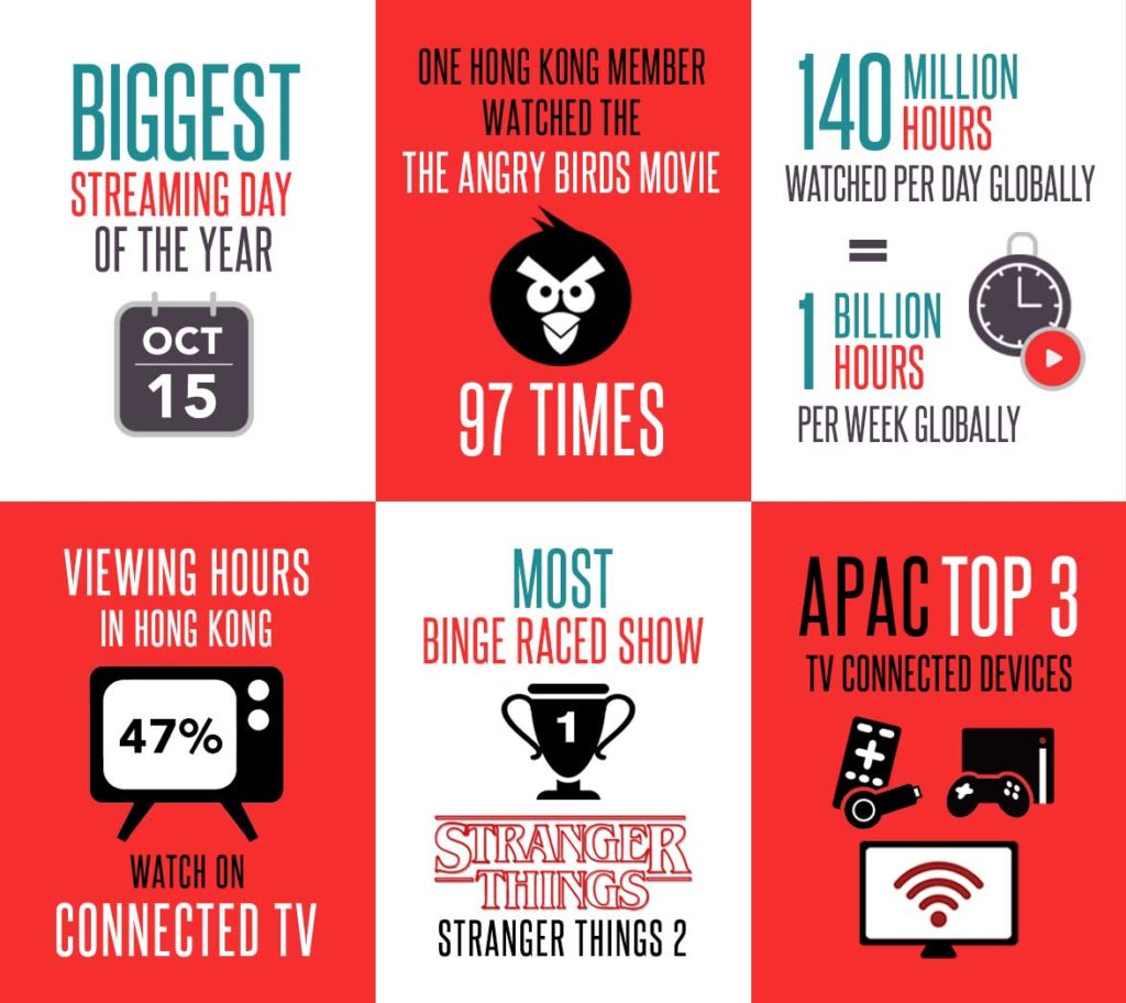 In other interesting Hong Kong data: Typhoon Khanun brought the highest number of hours streamed on Netflix for a particular day; about 47% of viewers were enhanced via TVs sporting 4K, HDR, or Dolby Atmos quality; and the average Hongkonger proved some of the world’s fastest bingers, knocking out their favorite programs in just three days compared to four globally.