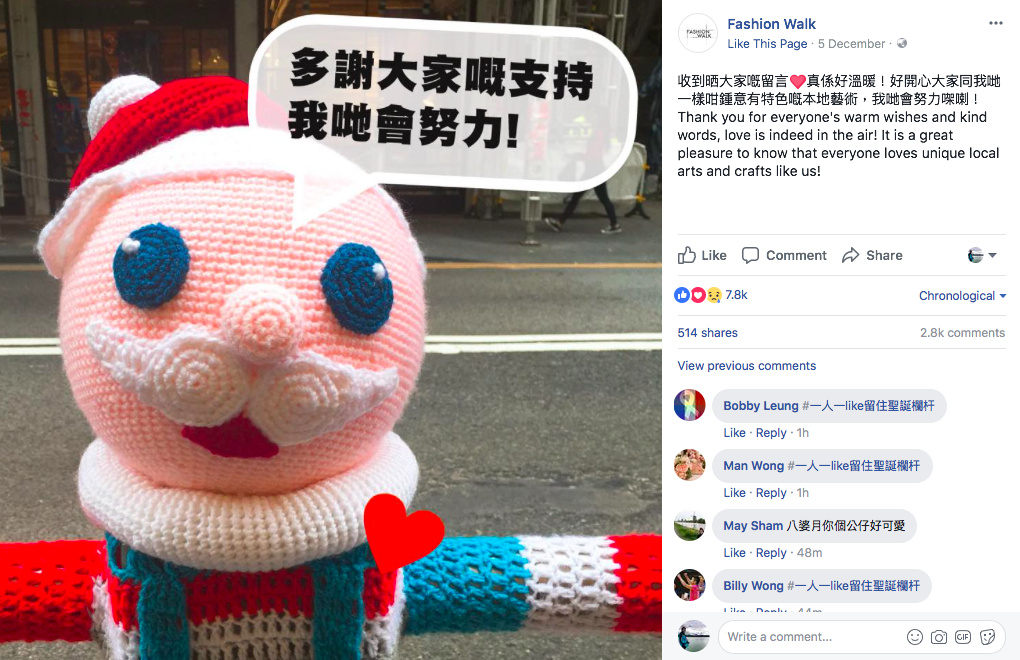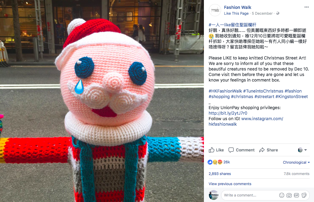 In a bid to keep the display in place, Fashion Walk and La Belle Epoque turned to Facebook, posting that they were told to remove the yarn installation by Dec. 10, and calling on Hongkongers to “like” the post in order to keep the installation.