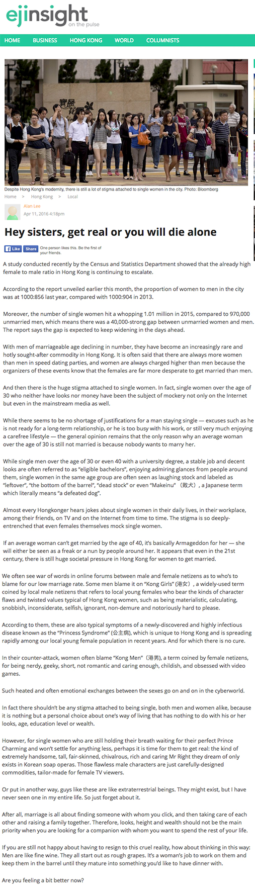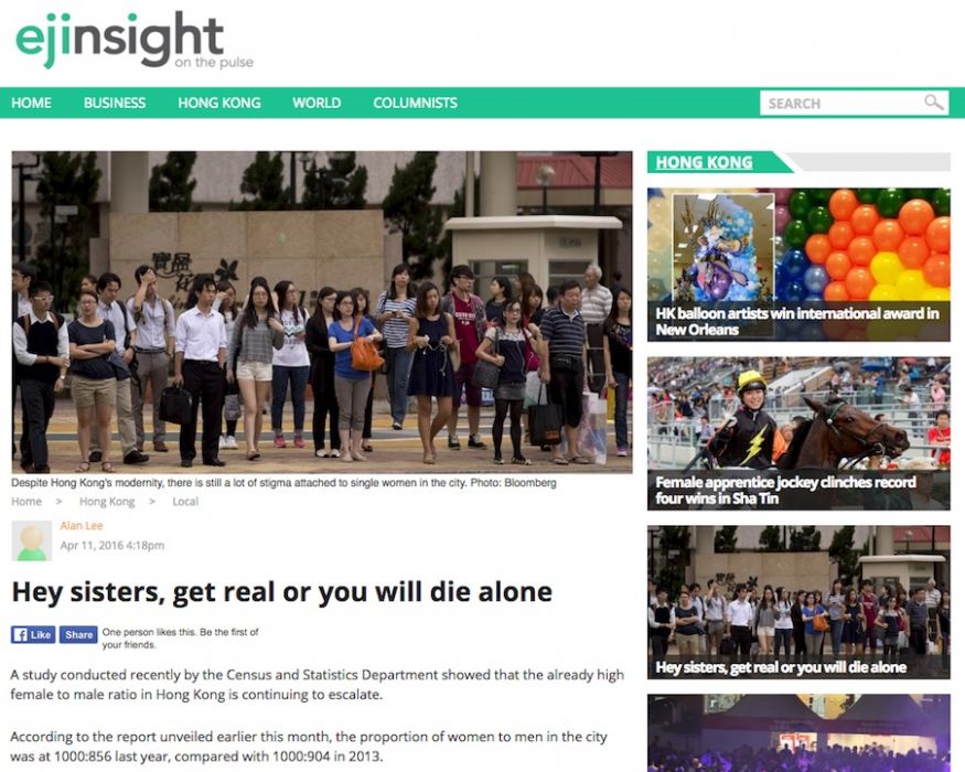 EJ Insight – the Hong Kong Economic Journal’s English-language blog – deleted a column titled “Hey sisters, get real or you will die alone” last week, days after its publication.