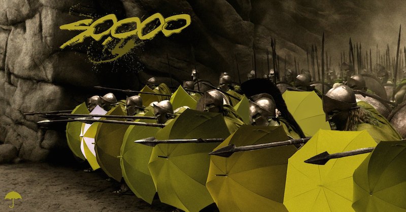 Sam Inglis, a Brit born and raised in Hong Kong, has made these graphics depicting the Spartan warriors made popular by 117-minute-long bodybuilding show 300… holding yellow umbrellas. He said he did it “just for a laugh”, and laugh we did. Zack Snyder would be proud.
