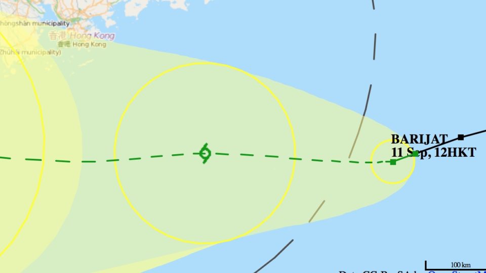 Barijat, which formed from a low pressure area to the east, was about 460 kilometers east-southeast of Hong Kong as of 11am. For you detail-hungry geography nuts out there, that’s about 20.8 degrees north 118.3 degrees east.