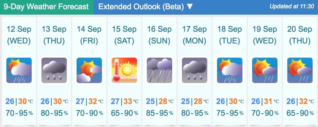 With the temperature currently hovering around 30 degrees celsius, the forecast for today is for “mainly fine but hazy” conditions tending to hot in the afternoon with moderate northerly winds.