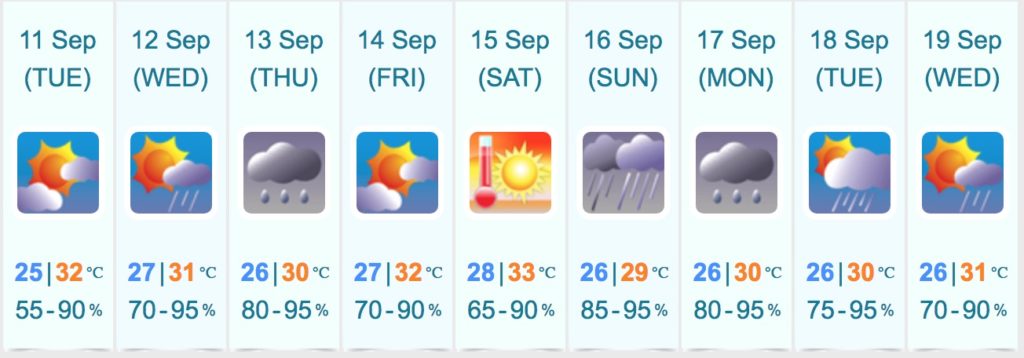 Tonight will be cloudy with a few rain patches, while tomorrow should be mostly fine but hazy with temperatures ranging between 25 and 32 degrees celsius.