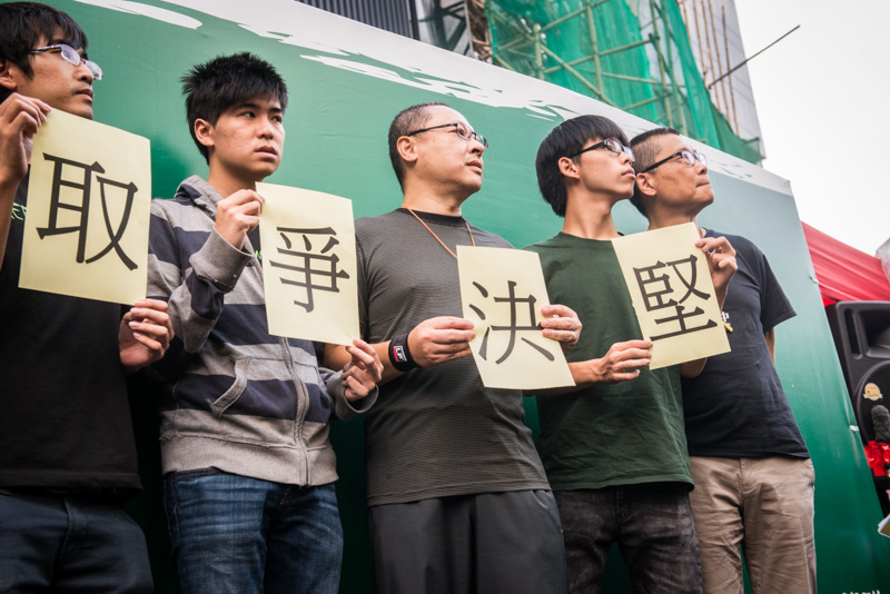 The leaders of the Umbrella Movement on Oct. 9, holding signs that read “keep fighting”. (Laurel Chor/Coconuts Media)