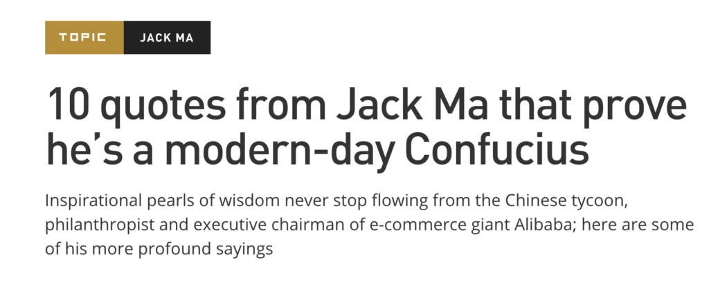 “Inspirational pearls of wisdom never stop flowing from the Chinese tycoon, philanthropist and executive chairman of e-commerce giant Alibaba; here are some of his more profound sayings,” read the original piece’s subhead, prior to the edit.