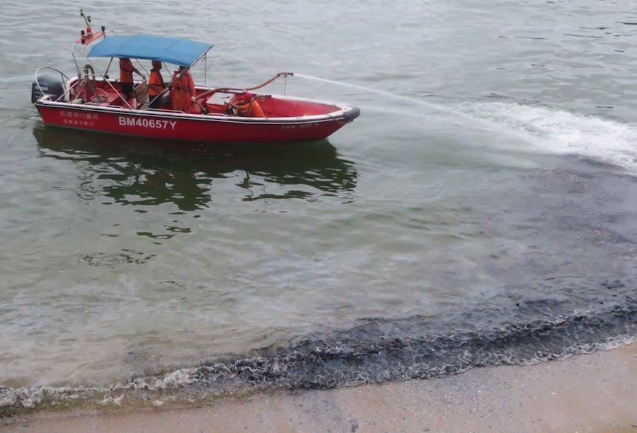 RTHK reports that the beach was closed to swimmers, and booms were set up to prevent the oil from coming ashore, with the authorities clearing “most of the slick” that day.