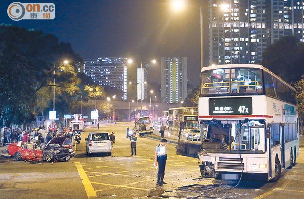 The bus hit an oncoming taxi, which then collided with a minibus and a private van. Another passing double-decker bus was hit with debris.