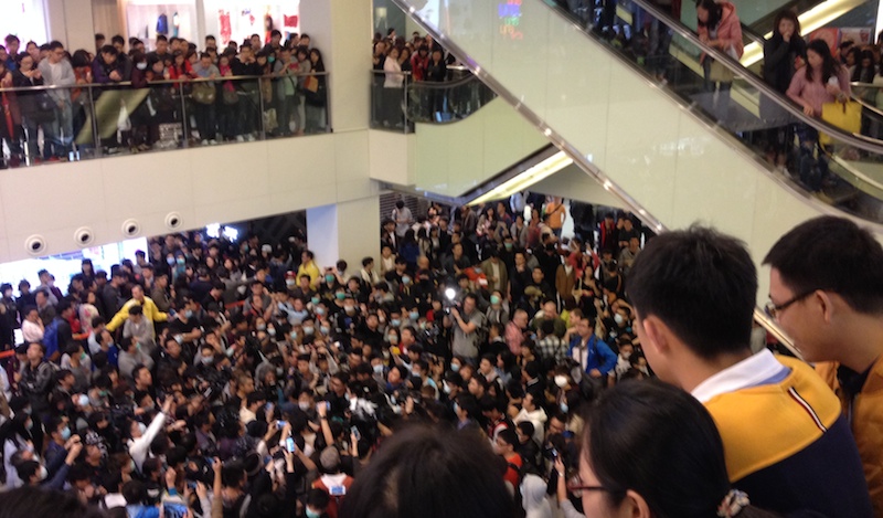 Crowds gathered inside the mall holding up banners and slogans, such as “be patriotic and use Chinese goods”.