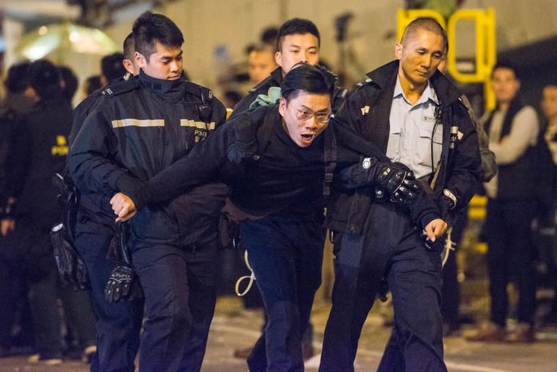 A protester is carried away by the police during the clearance of the main Umbrella Movement camp in Admiralty on Dec. 11, 2014. (Laurel Chor/Coconuts Media)