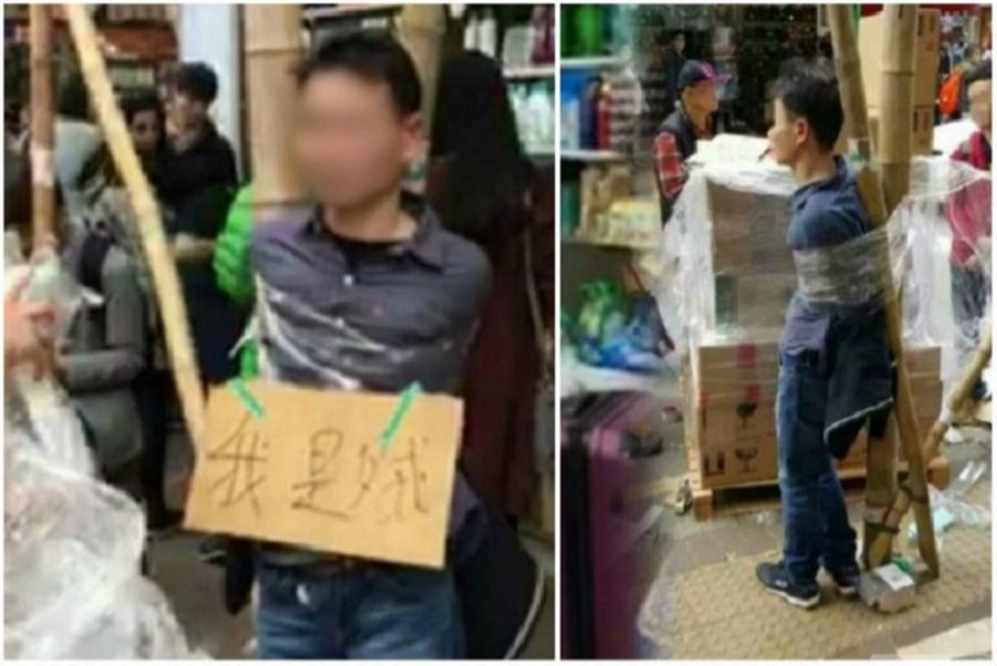 Staff at a Sheung Shui pharmacy secured a man to some bamboo scaffolding with a sign saying “I am a thief” after he allegedly tried to make off with HKD1,500 of milk powder.