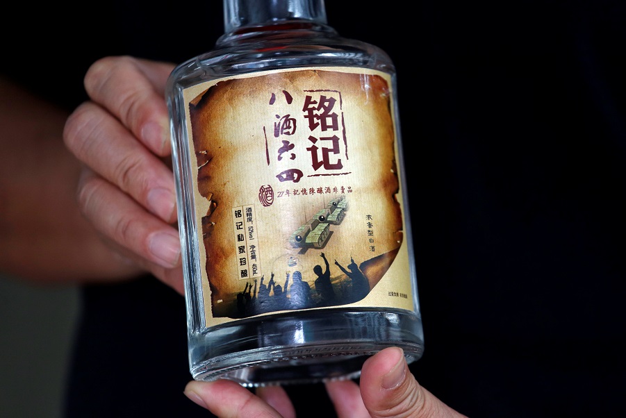 Footage was shown of the relatives of four men who were arrested and later charged for subversion by Chinese authorities for manufacturing and selling bottles of Chinese liquor, or “baijiu”, with specially designed labels commemorating June 4.