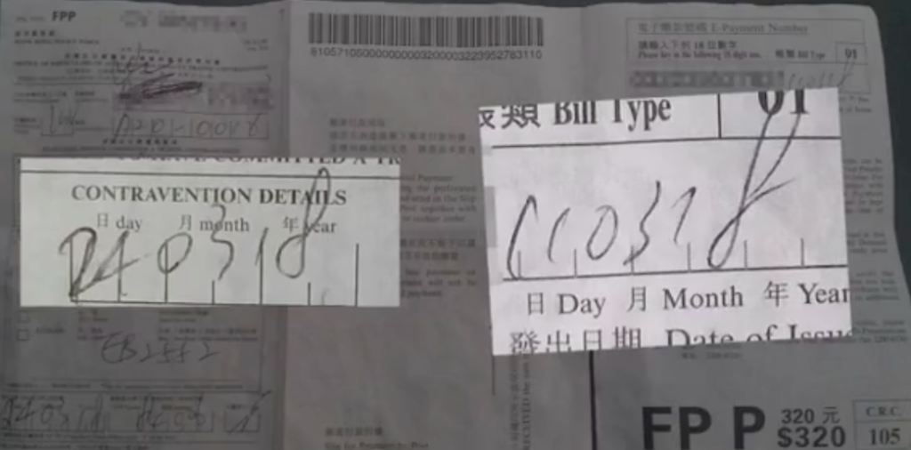 Upon closer inspection, Mui found the ticket, which looked old and frayed at the edges, had been altered, with someone changing the time stamp and crossing out the registration number and replacing it with his.
