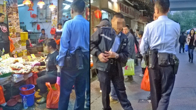 Last night, one disgruntled onlooker took these photos of police officers allegedly perusing a Mong Kok street market for the perfect seafood to grill at their BBQ that night.