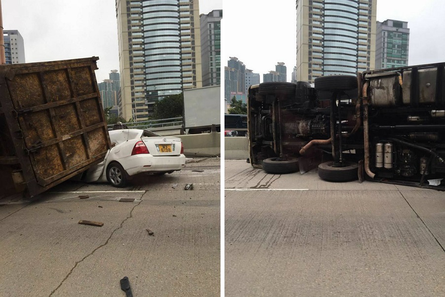 The Sun reports that the recycling truck’s driver, a 51-year-old man, surnamed Leung, was reportedly driving along Ching Cheung Road towards Kwun Tong. As the truck approached Butterfly Valley Road, Leung lost control and the vehicle tipped over, landing on a white Toyota.