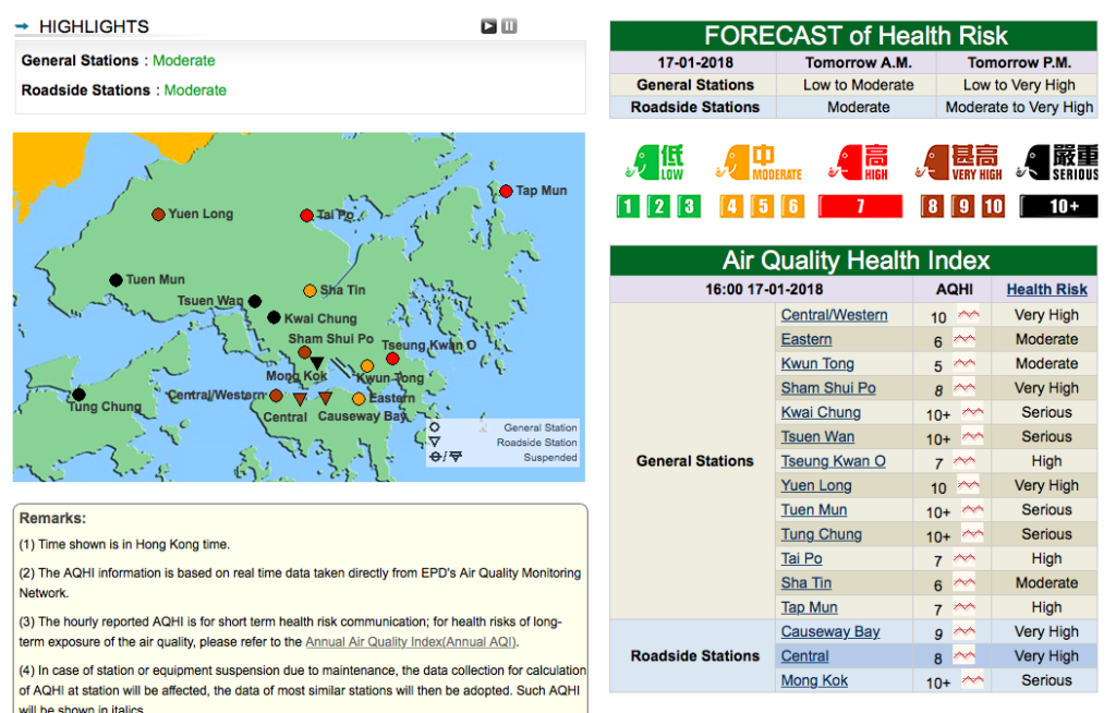 As of 4:00pm today, two areas — Central and Tuen Mun — recorded a “very high” health risk level of 10. Kwai Chung, Tsuen Wan, Tuen Mun, Tung Chung and Mong Kok recorded a “serious” health risk level of at least 10.