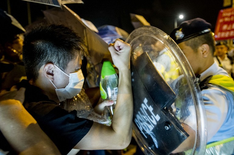 Police repeatedly used pepper spray against protesters, who used umbrellas, surgical masks and goggles to protect themselves.