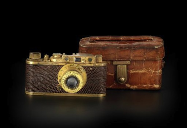 The camera, which is gold-plated and comes with a crocodile skin case, had previously belonged to a British amateur photographer who acquired it soon after the World War II, Bonhams said.