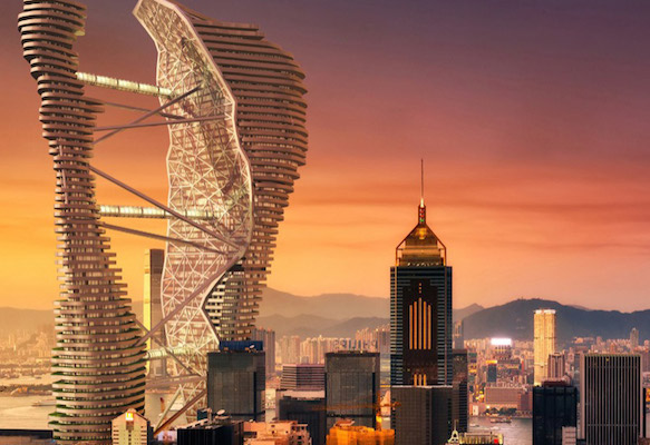 Created by Mexico’s Studio CTC, the renderings for these two twisted skyscrapers – complete with fish farms, an algae facade (whatever that is), wind farms and rooftop rice paddies – are set in Central Hong Kong!