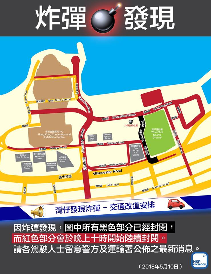 In statements on their Facebook page, the Hong Kong police force advised that several roads in the area would be closed and access to buildings in the area restricted while officers from the Explosive Ordnance Disposal Bureau assessed the situation.