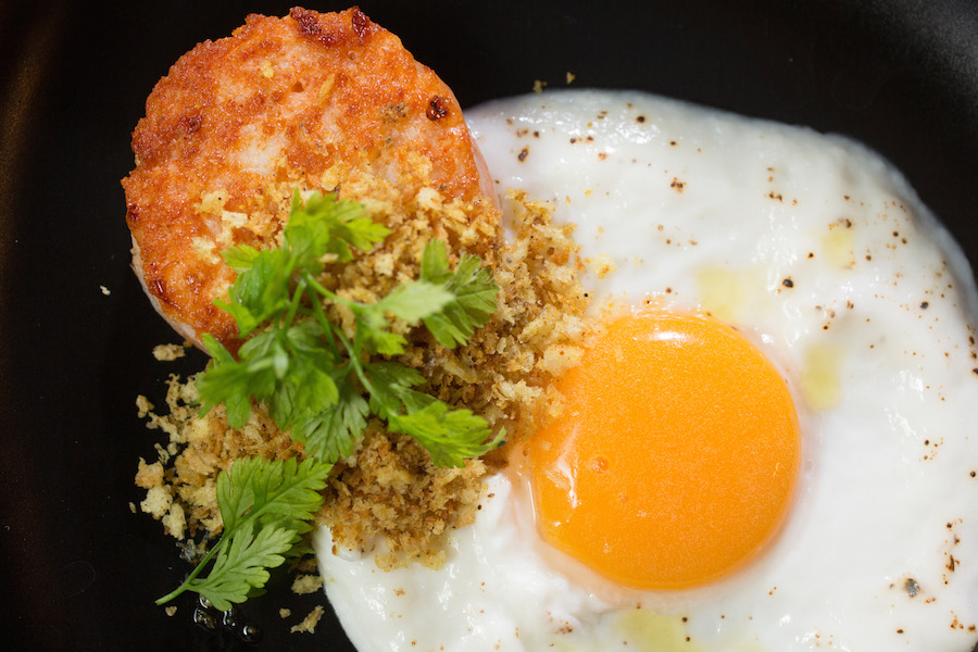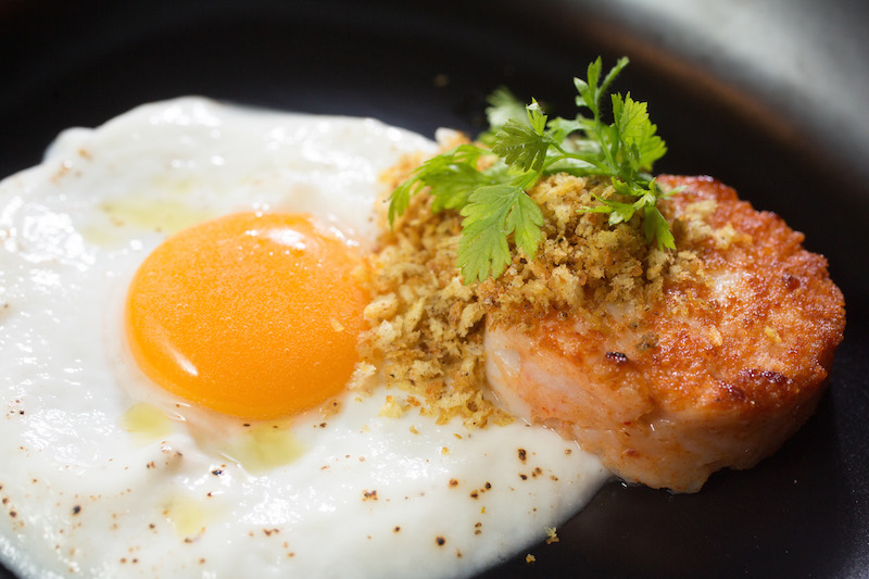 Sausage and Egg, which contained no sausage and no egg. The piece of the puzzle that looked and behaved exactly like a sunny-side-up egg (the yolk even popped!) was in fact pumpkin in coconut milk, while the sausage was a medallion of lobster sprinkled with madras curry crumbs.