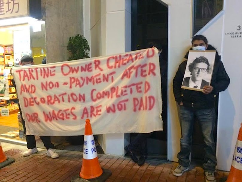 A small baying mob stood in front of the fancy open sandwich restaurant on Lyndhurst Terrace, holding signs in both English and Chinese accusing the restaurant’s co-owner, Arthur de Villepin, of not paying them for decoration work.