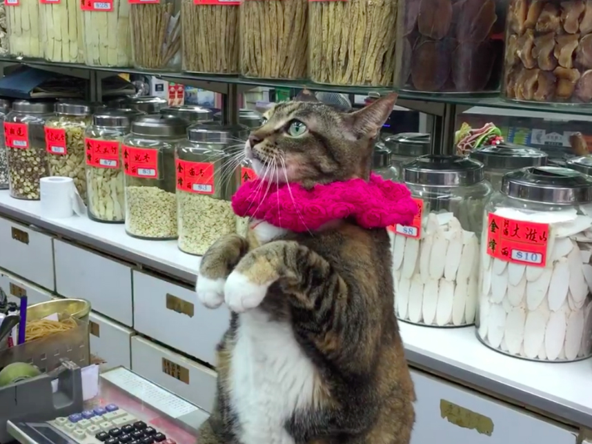 The cat, whose name is Hawaii, lives in a pharmacy in Wan Chai and has won fans all over Hong Kong for her penchant for wearing colourful bracelets and scrunchies around her neck, uncharacteristic willingness to do tricks, and her seemingly untapped potential as a Musical Chairs player.