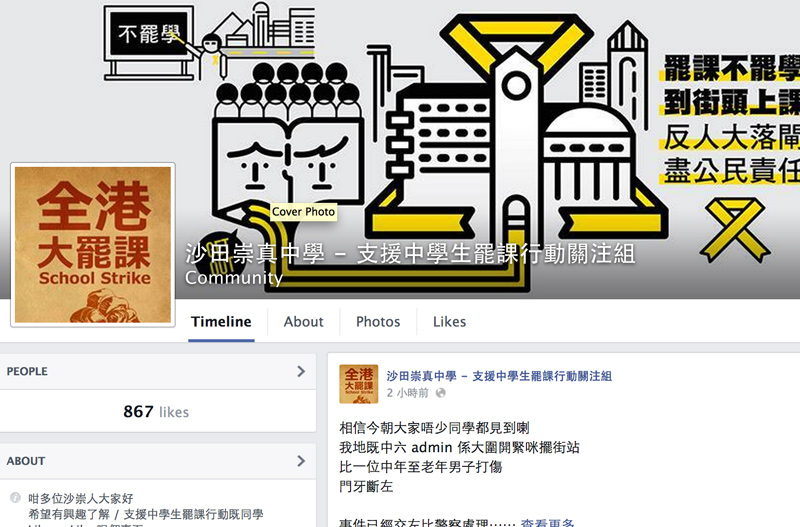 A Facebook group claiming to be a support a student boycott at the Shatin Tsung Tsin Secondary School has claimed that a Form 6 student was attacked by a middle-aged man in Tai Wai while they were demonstrating in the street. The boy’s front tooth was broken and he required medical attention, they claimed.
