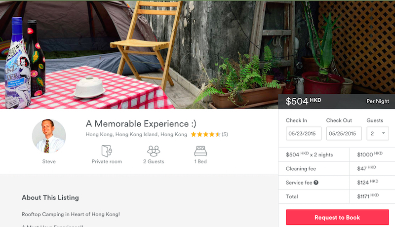 Charging HKD250 per person, per night (plus cleaning fee and airbnb’s service fee), Steve calls the tent a “must-have experience”, asking you to “immagine [sic] surrounded by beautifully lit up buildings sipping your favorite beverage :)”.