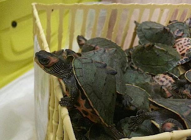The 356 black pond turtles are restricted to distribution in Bangladesh, India, Nepal and Pakistan only, while both this lot and the 266 Indian roofed turtles they travelled with are listed in the Convention on International Trade in Endangered Species of Wild Fauna and Flora.