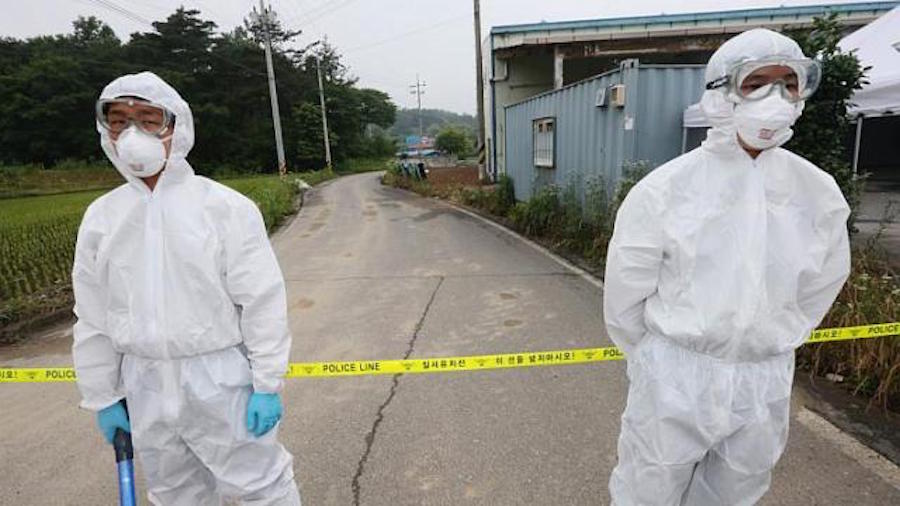 Health workers wearing protective suits stand by the cordon of a quarantined village in Boseong, South Korea on June 11, 2015. (Photo: AFP)