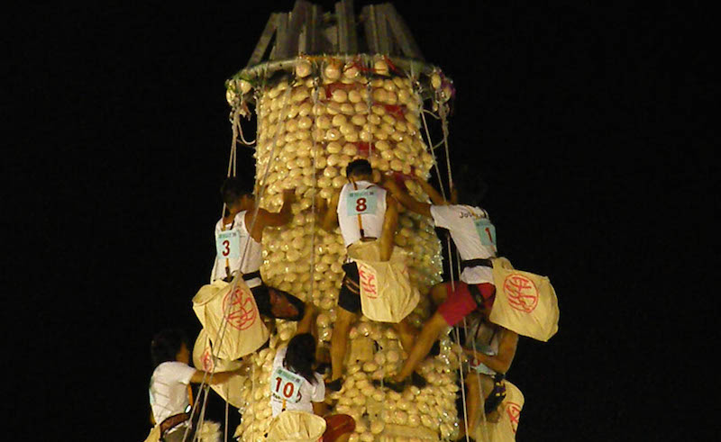 The annual event, the highlight of Hong Kong’s Cheung Chau Jiao Festival, will once again see nine men and three women race against the clock to grab scored buns from a huge tower made of said buns.