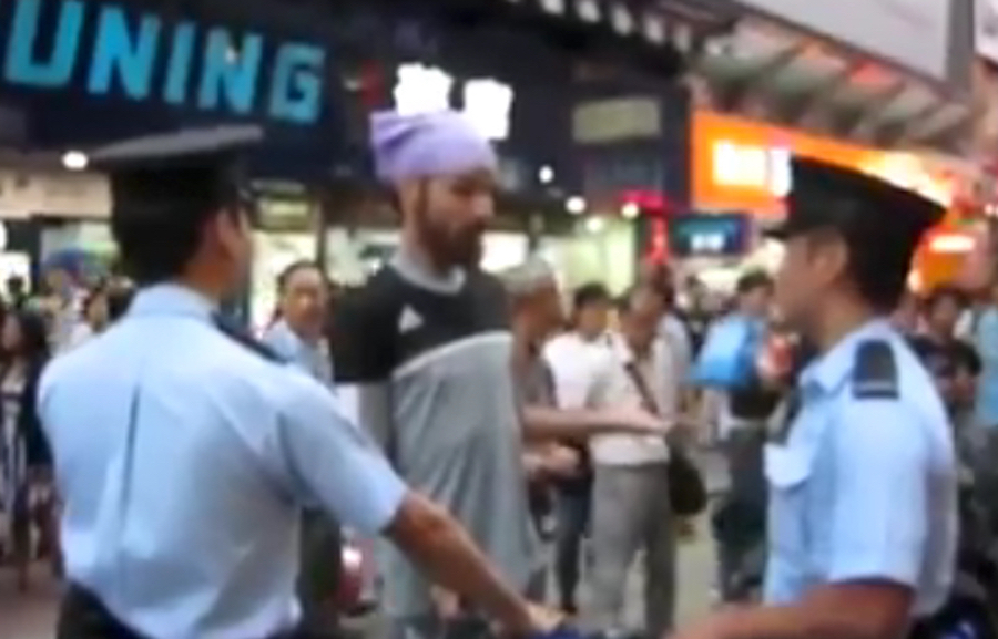 In the clip, posted by Choudhoury Sahid, it appears as though a foreigner was “walking” his bike through Causeway Bay while sitting on the seat when he was stopped by the police.
