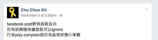 Unsurprisingly, the outspoken Maritime and Logistics Studies student had a lot to say to the tattletale. In the above post, he wrote: “I have the right to post what I want on Facebook. If you ugly pricks don’t like what I post, you can ignore them. Complaining to PolyU about me, you guys are like primary school kids.”